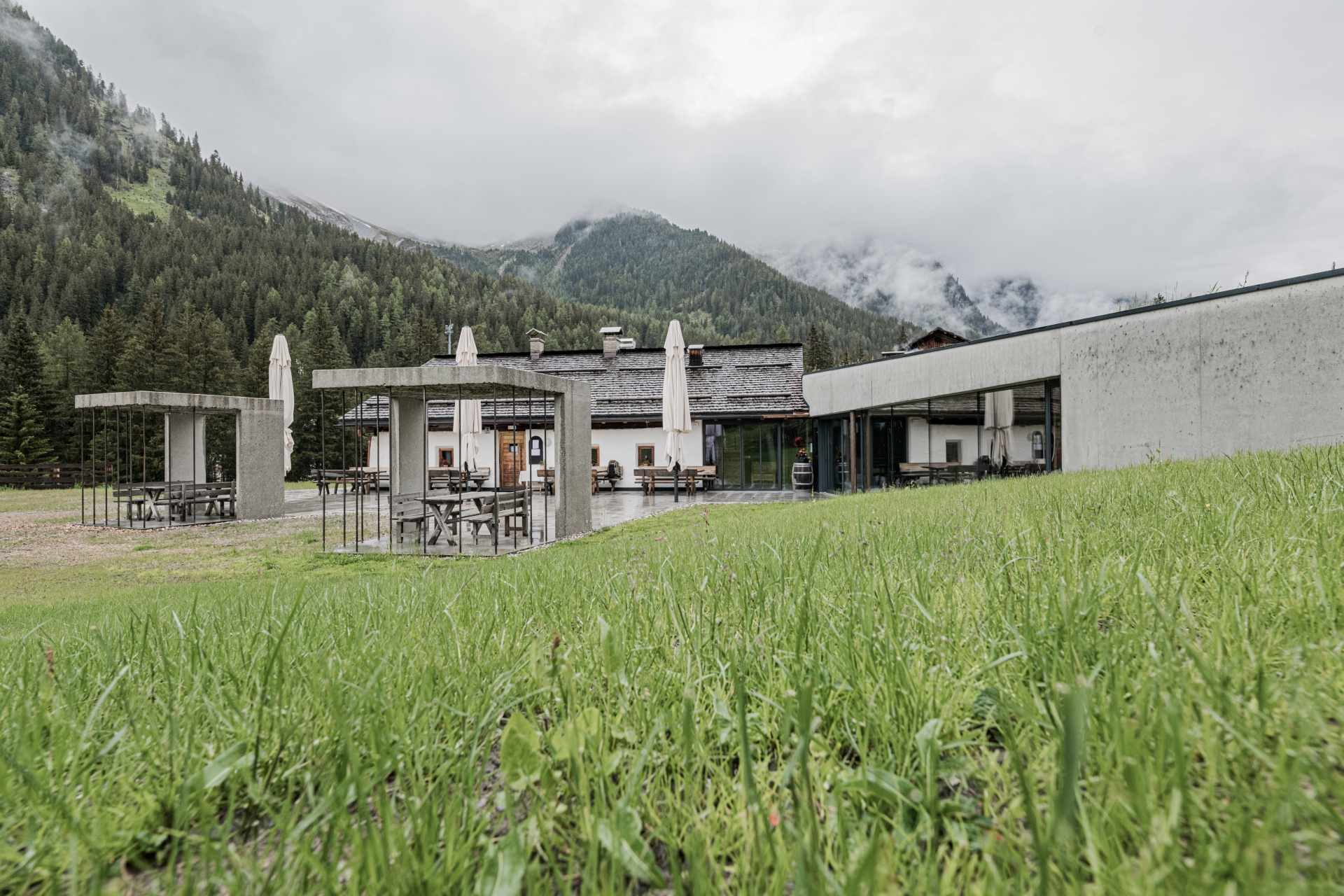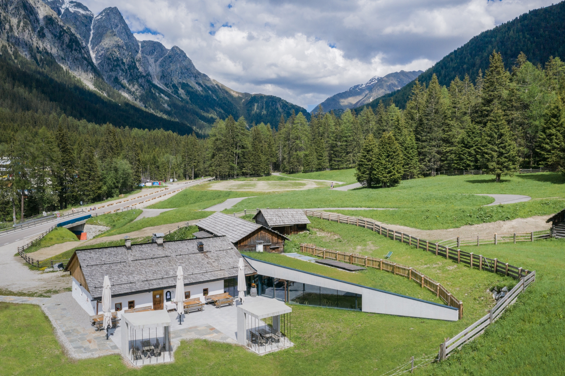 “trovandoci in una zona, sì edificata, ma dove la natura e l’imponenza delle montagne dominano la scena, è stata fondamentale la volontà di adattare gli interventi sia al costruito preesistente, che alle asperità dell’ambiente naturale circostante.” “per rafforzare il legame con il contesto, sulla superficie dei nuovi spazi esterni, sono state impresse le impronte della pietra locale.” “All’interno della malga, il salone con la stufa a legna è stato in gran parte conservato nel suo stato originale: le pareti e il soffitto, anneriti dalla cenere del camino, sono stati mantenuti” “Lo spazio per il pranzo e le premiazioni, presenta un soffitto dalla superficie estremamente strutturata e materica, interamente verniciata in oro, colore della vittoria.”