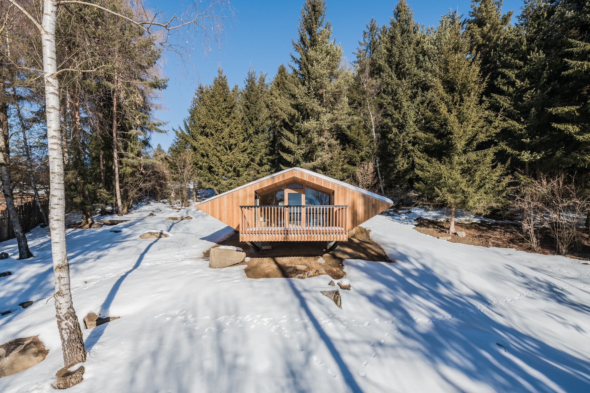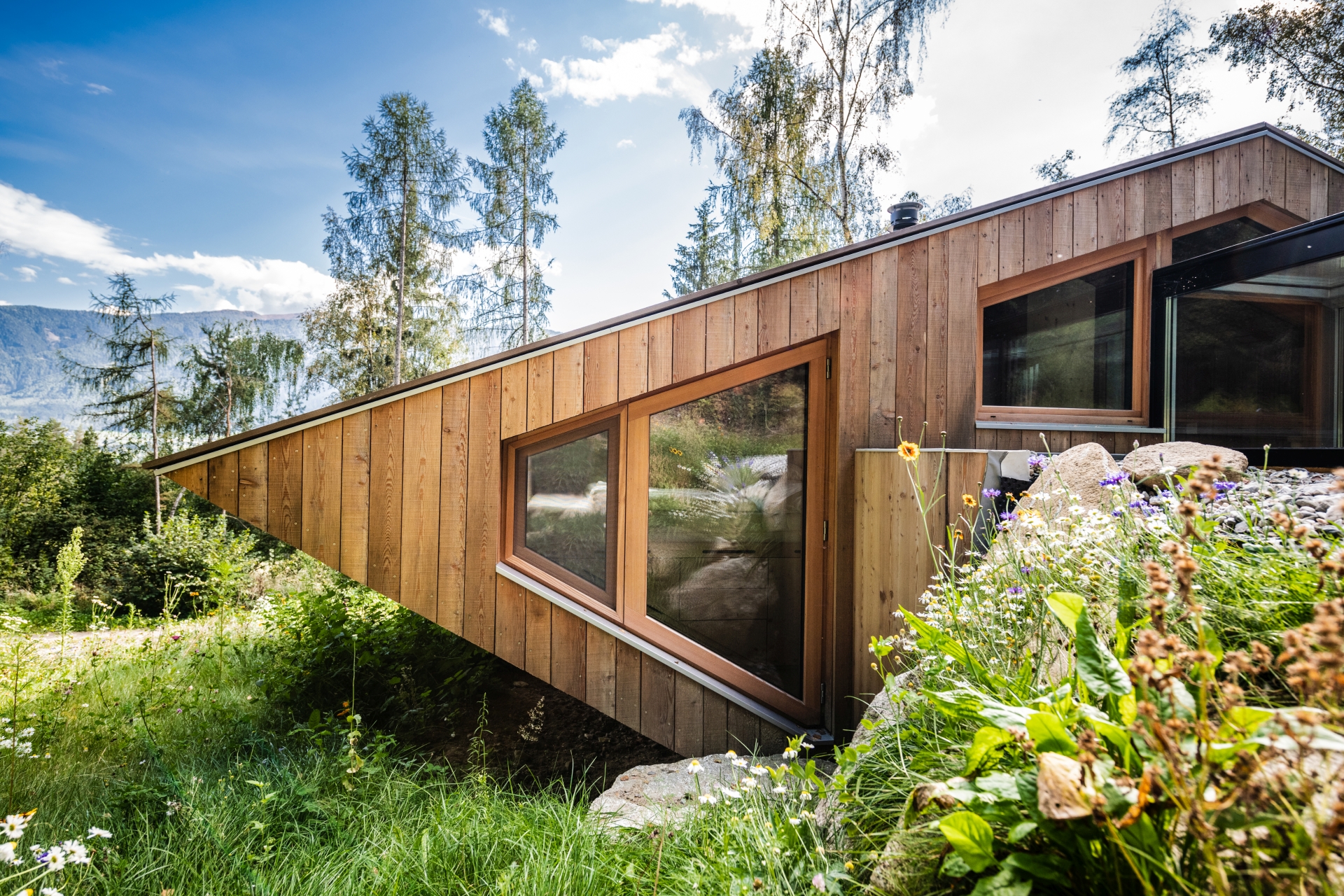 “la scala di accesso in acciaio corten scompare nella parete laterale come una scala di una navicella spaziale, l’intera casa sembra galleggiare dal terreno.”